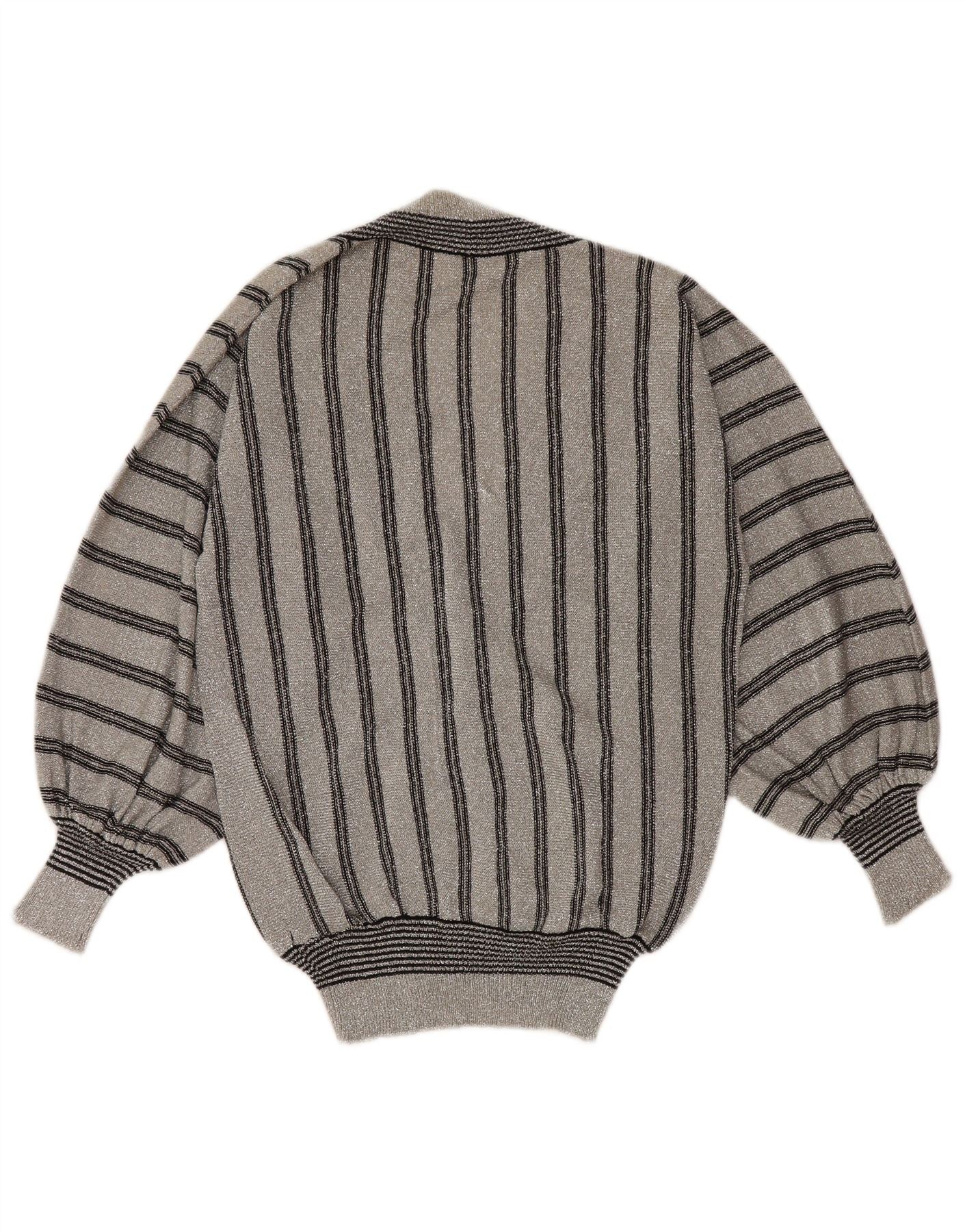 Suéter feminino VINTAGE com decote em V UK 12 cinza médio listrado sintético