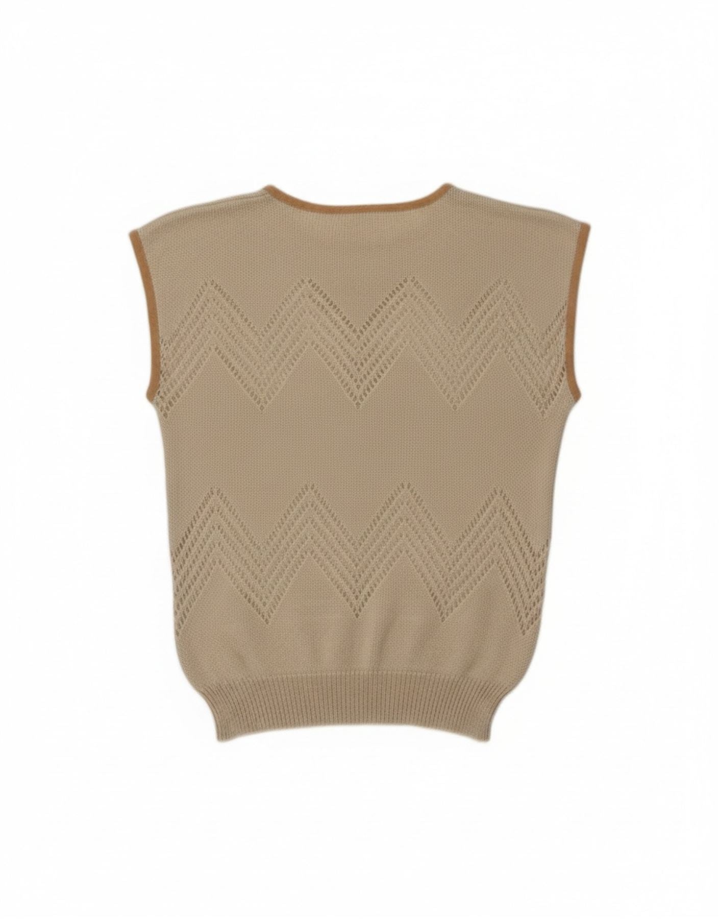 - Descrição da IA: Esta regata feminina vintage é feita de uma mistura de malha bege de acrílico, linho e algodão. Apresenta um delicado padrão chevron em toda a malha. Um elegante gráfico floral bordado adorna a frente. O design sem mangas e o decote redondo oferecem uma silhueta clássica. Um ajuste regular garante um uso confortável. Este pulôver combina charme boêmio com detalhes refinados.