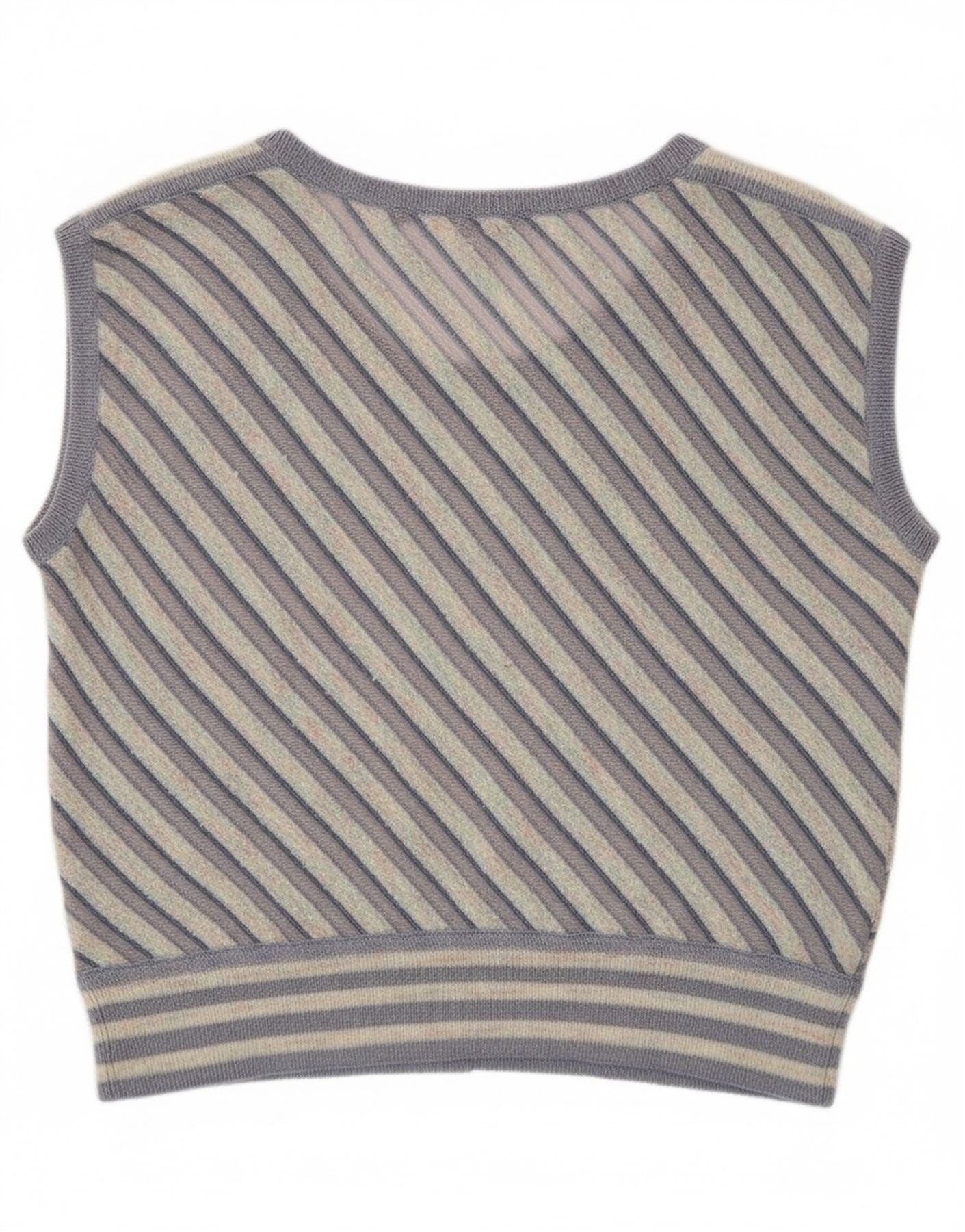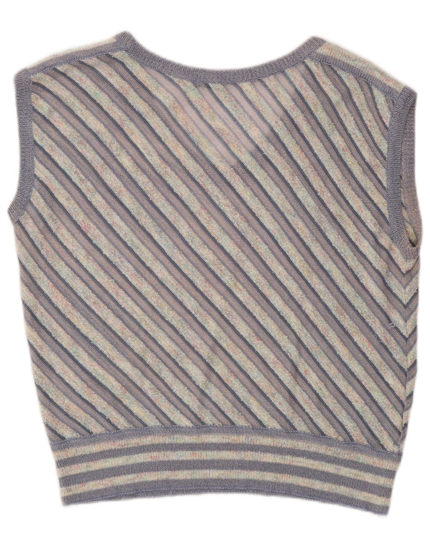 • Descrição da IA: Este colete feminino vintage é confeccionado em tecido de malha macio, com padrão listrado multicolorido. As listras diagonais em lilás, off white e bege criam uma estética retrô. Possui decote em V clássico e design sem mangas para um ajuste confortável. O estilo pulôver garante facilidade de uso. Seu corte regular oferece uma silhueta descontraída e elegante.