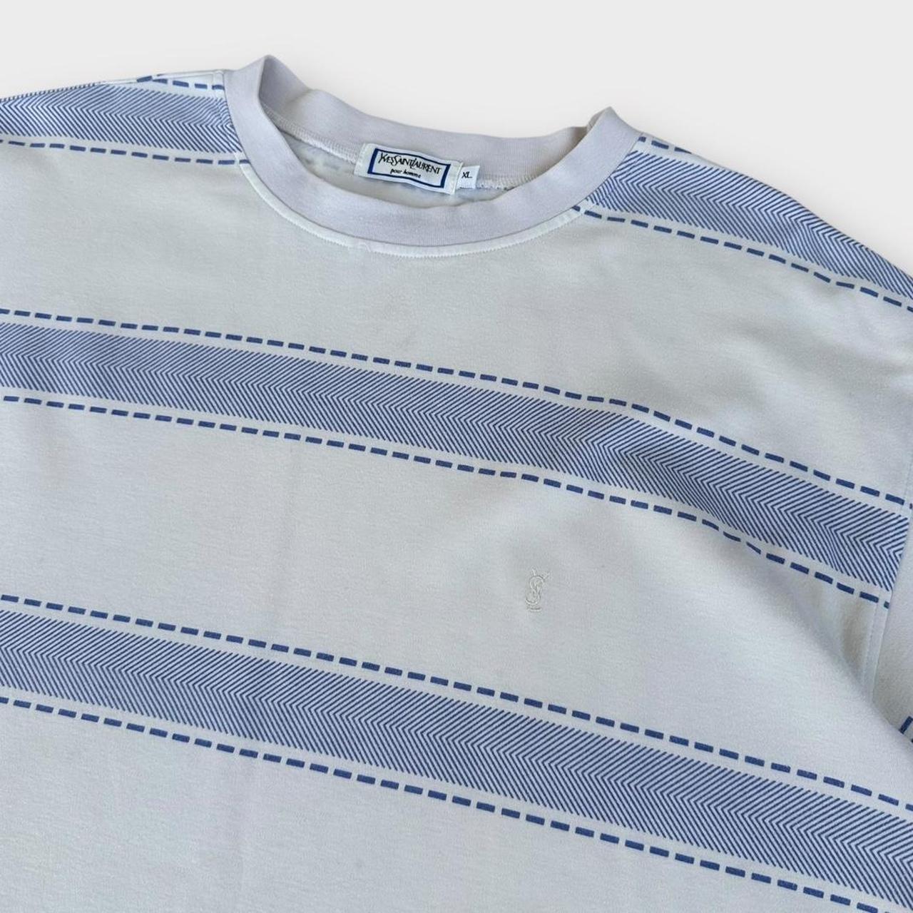Camiseta vintage Yves Saint Laurent listrada em azul e branco dos anos 90 com logotipo bordado no peito