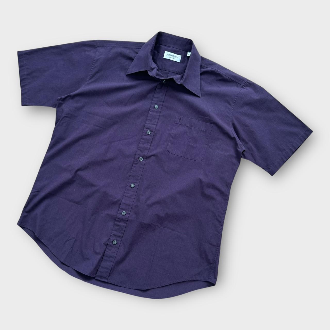 Camisa Yves Saint Laurent vintage de manga curta com botão, do início dos anos 2000, na cor marrom / roxo com logotipo bordado no peito