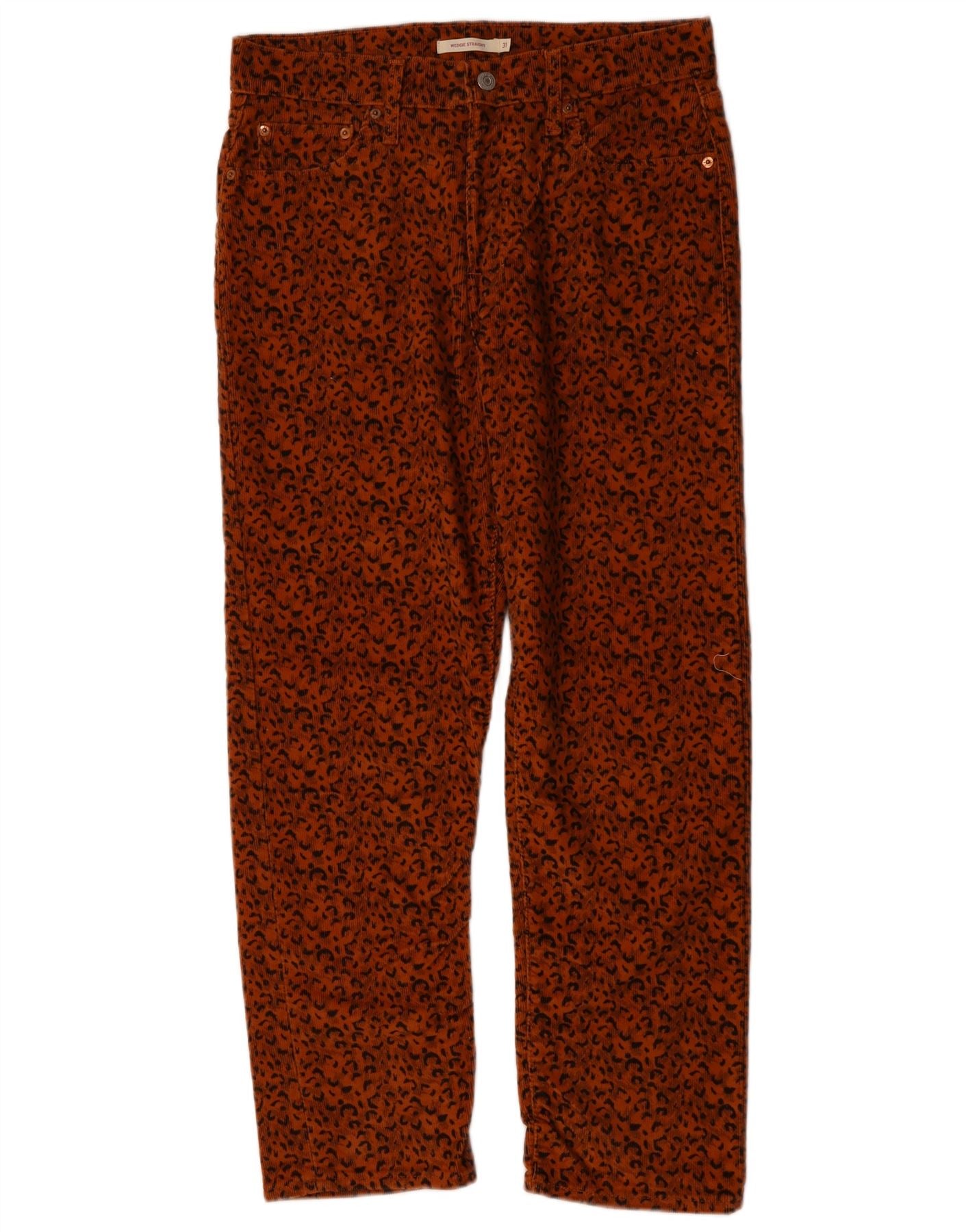 - Descrição da IA: Estas calças femininas de veludo cotelê Levi's são confeccionadas em tecido macio de veludo cotelê em um rico tom laranja. Eles apresentam um impressionante padrão de estampa animal por toda parte. Acentos cravejados adicionam um toque de detalhe. As calças oferecem um ajuste regular confortável com corte reto nas pernas. Um fecho de botão protege a cintura. Bolsos práticos completam o design, combinando estilo com utilidade.