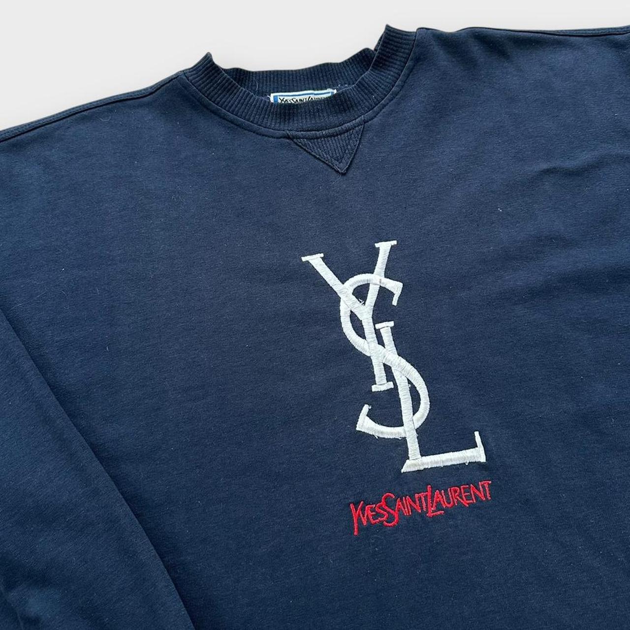 A perna da bota Yves Saint Laurent vintage do início dos anos 2000 soletra o moletom com grande logotipo bordado em azul marinho