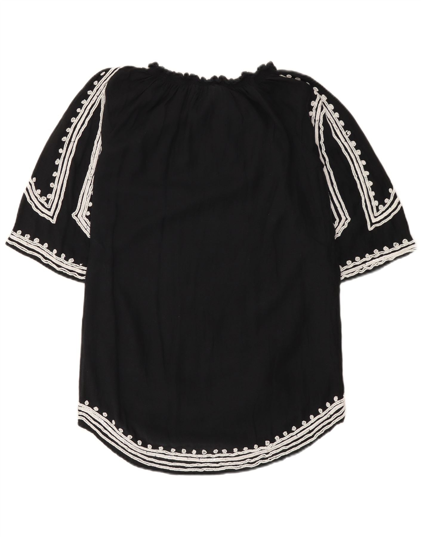 - Descrição da IA: Esta blusa feminina Zara é confeccionada em uma mistura leve de algodão e viscose, oferecendo uma sensação macia e confortável. Possui um decote redondo franzido, projetado para um ajuste fora dos ombros ou pescoço largo. Mangas curtas complementam a silhueta descontraída. O tecido preto é adornado com um intrincado padrão abstrato de contas brancas, criando uma estética boêmia marcante. Este estilo pulôver garante facilidade de uso, perfeito para um visual descontraído, mas distinto.