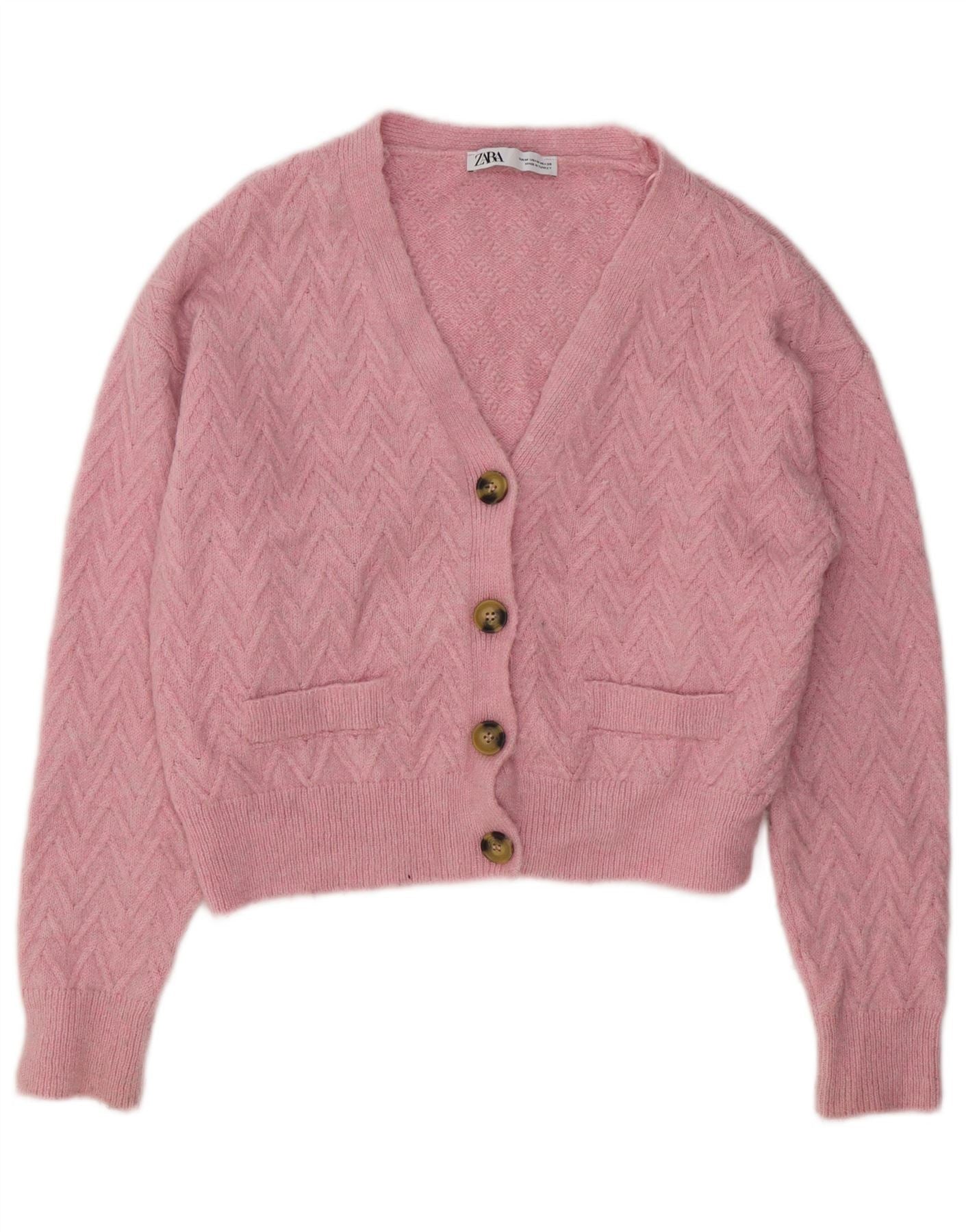 ZARA Suéter Cardigan Feminino Crop UK 14 Médio Rosa Chevron Acrílico