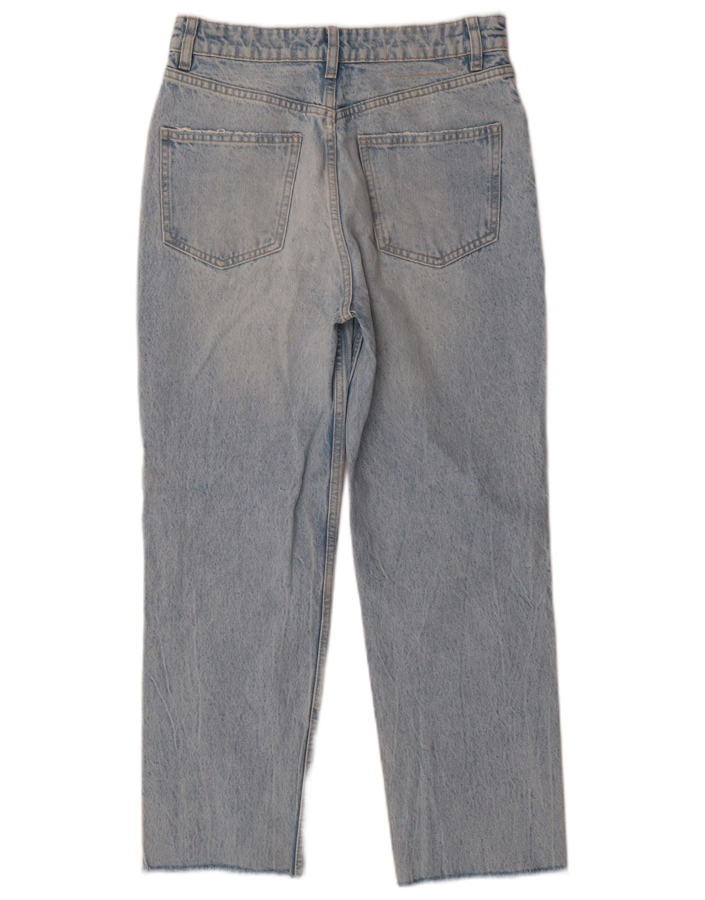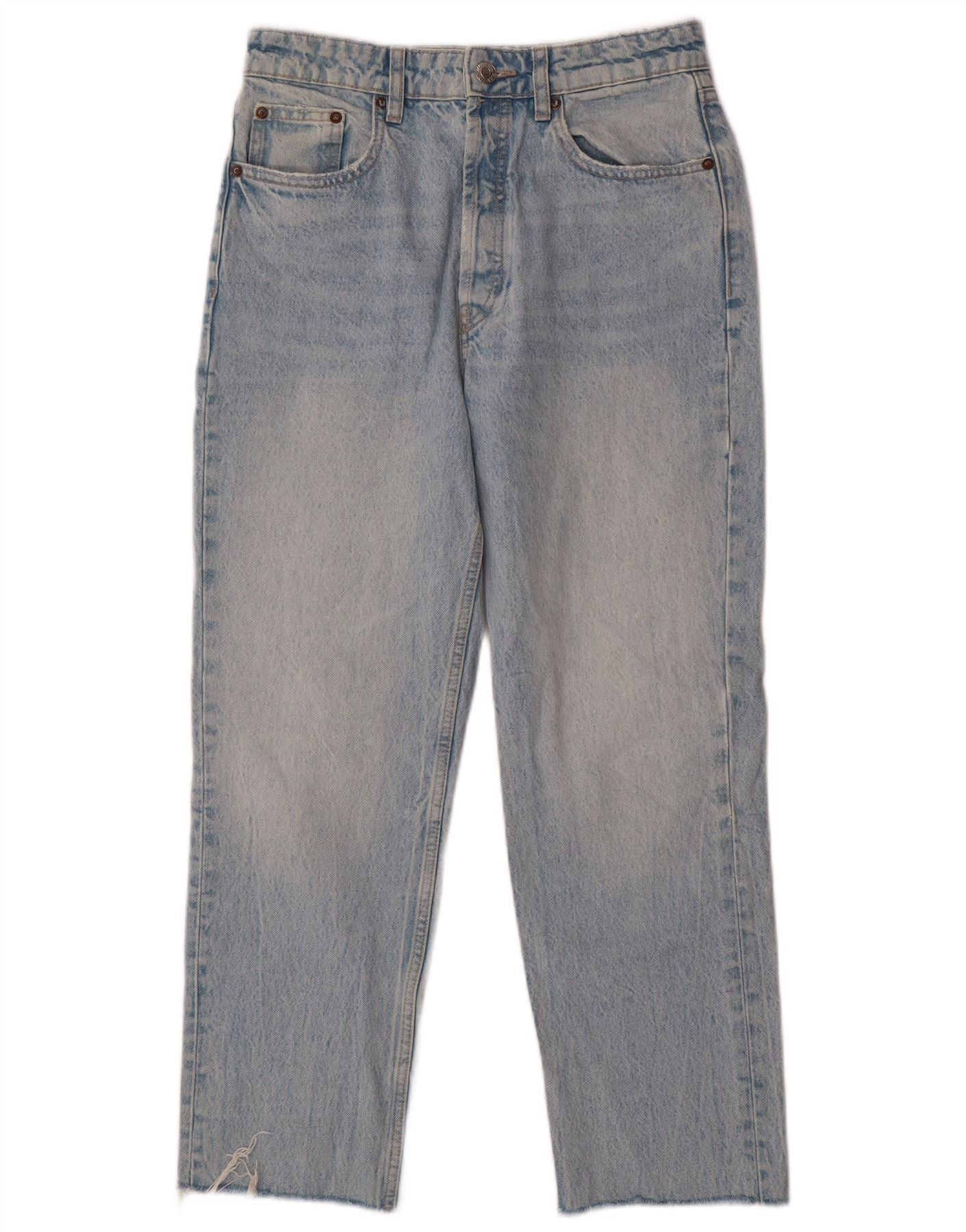 - Descrição da IA: Este jeans feminino da Zara é confeccionado em jeans 100% algodão azul. Eles apresentam cintura alta e corte reto clássico. O fecho de botão garante um uso seguro. Os detalhes desgastados adicionam um toque contemporâneo. Bolsos práticos estão incluídos. O comprimento cropped finaliza com barra crua, proporcionando um visual moderno e casual.