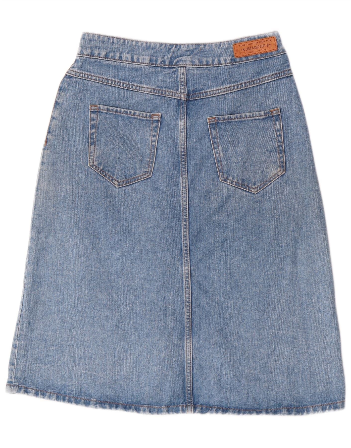 - Descrição da IA: Esta saia jeans feminina Zara é confeccionada em Heritage Denim azul, oferecendo um toque clássico e durável. Possui corte regular e silhueta evasê, caindo em comprimento midi. A frente é protegida com um fecho de botão completo. Bolsos práticos estão incluídos na frente e atrás. Os detalhes dos botões adicionam um toque tradicional a esta peça atemporal.