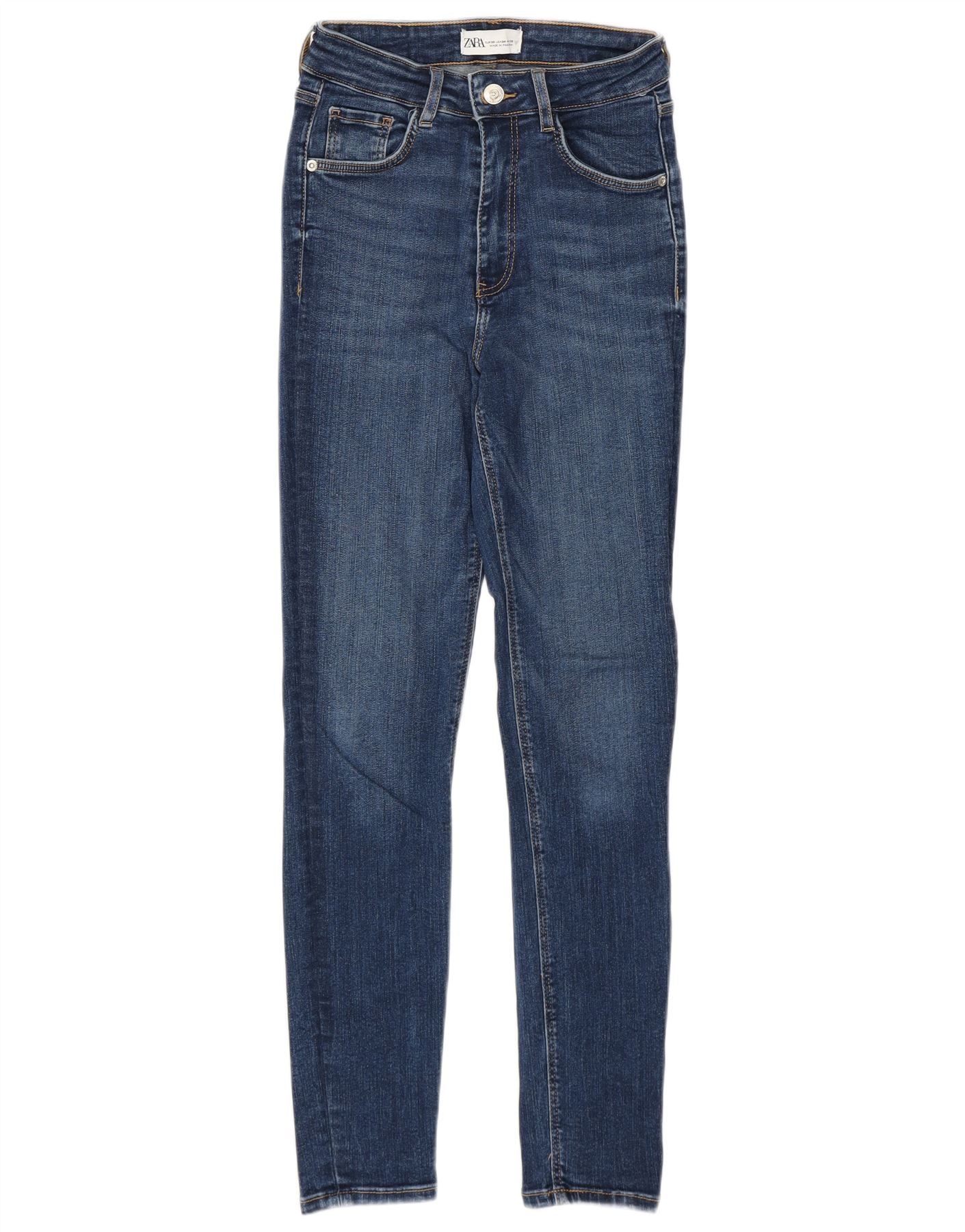 - Descrição da IA: Esses jeans skinny femininos da Zara são confeccionados em jeans azul com elasticidade adicional. A cintura alta e o fecho de botão criam uma silhueta lisonjeira. Estes jeans slim fit apresentam bolsos práticos e um design emagrecedor. O estilo moderno oferece uma aparência elegante e confortável.