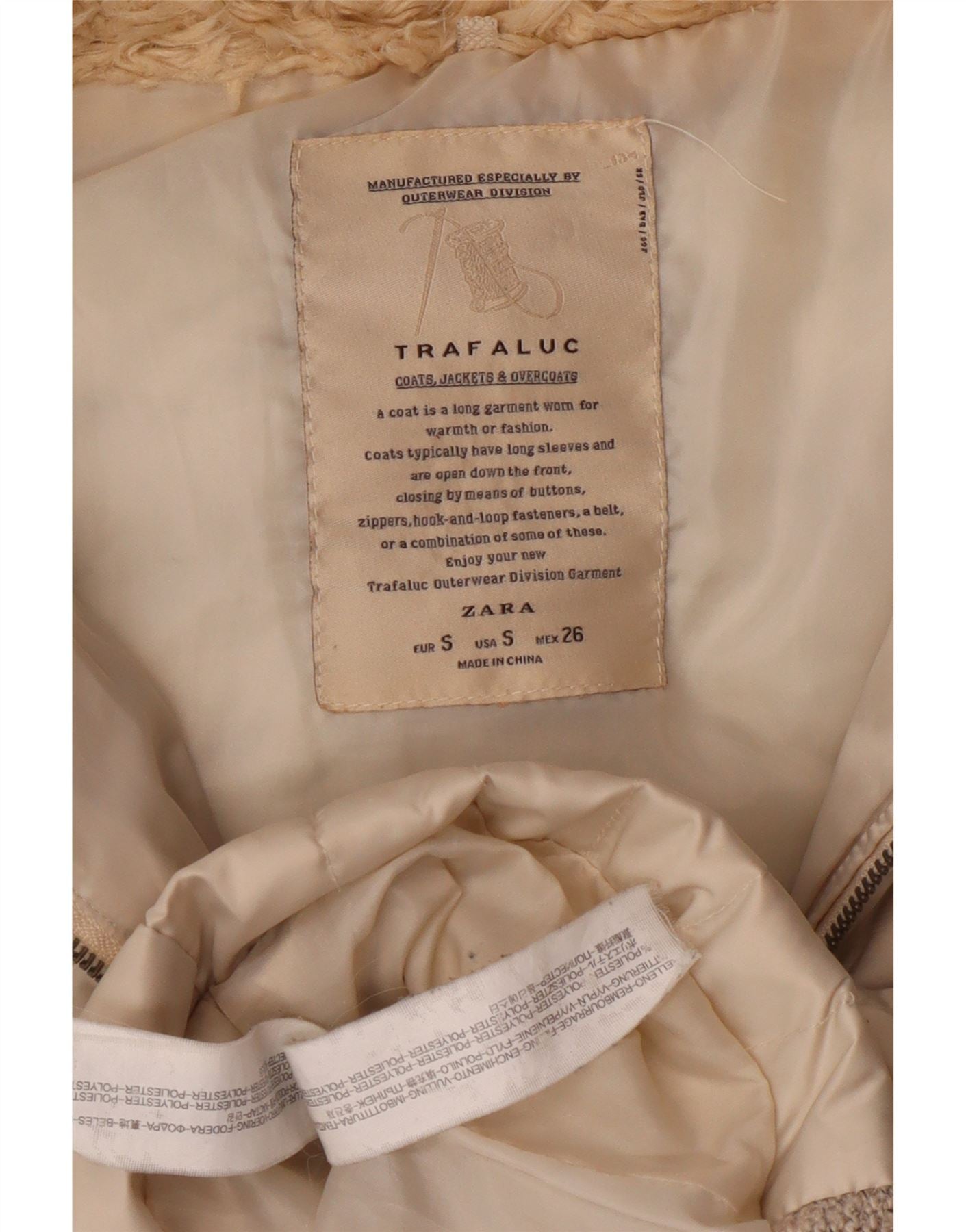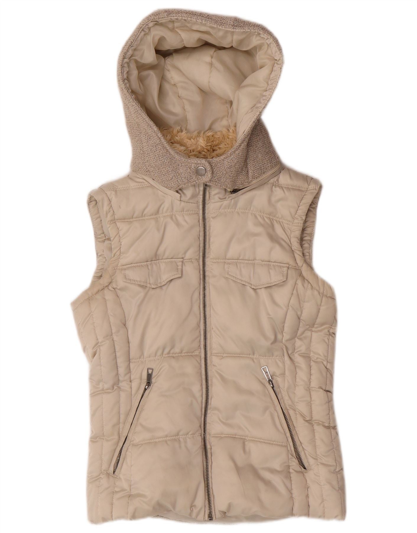 Colete acolchoado com capuz feminino Zara UK 10 pequeno poliéster bege