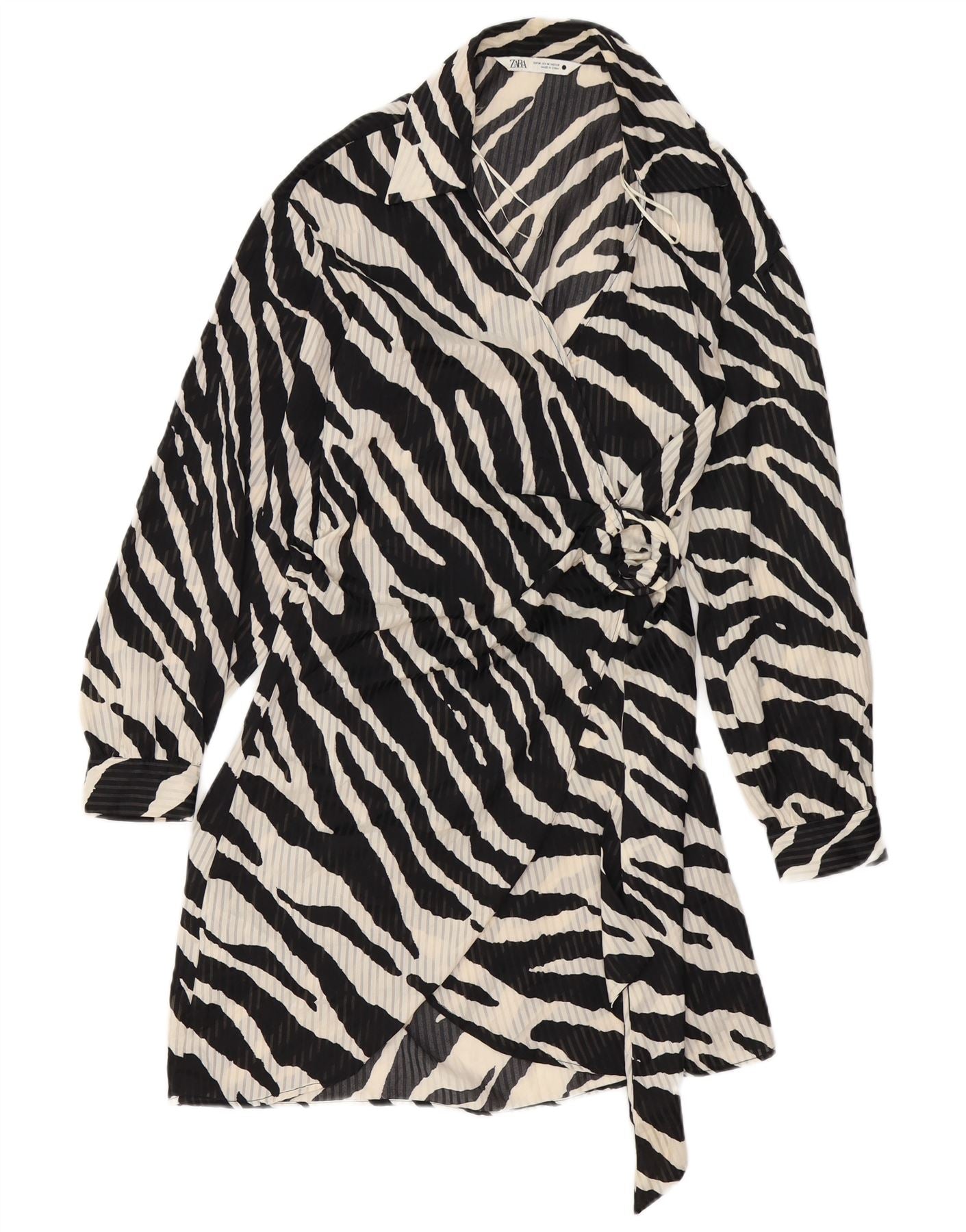 Vestido feminino ZARA de manga comprida UK 12 médio preto com estampa animal