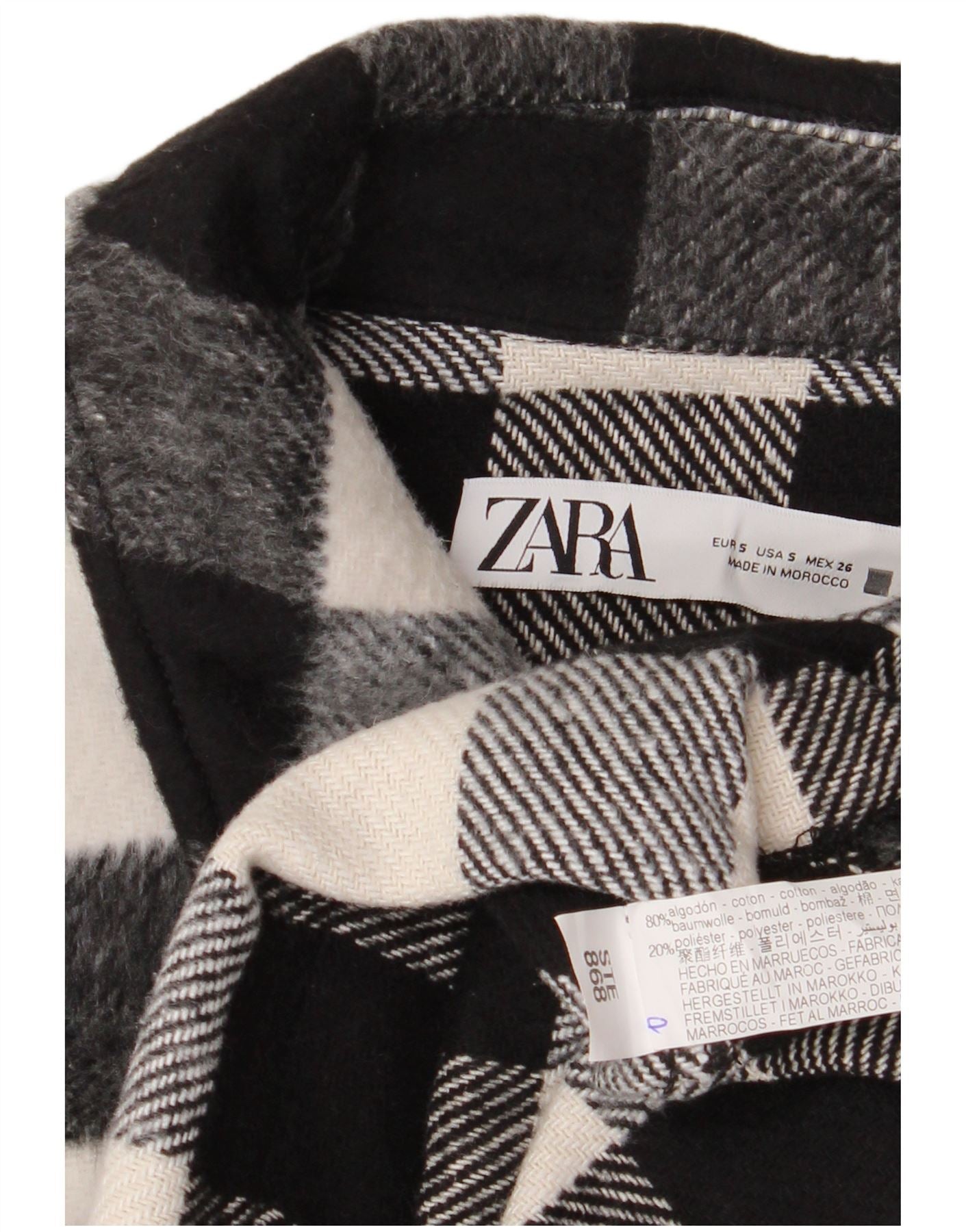 - Descrição da IA: Esta jaqueta feminina Zara é confeccionada em tecido macio de algodão misto com uma textura sherpa aconchegante. Ele apresenta um ousado padrão xadrez em preto e branco. O decote com gola e botões na frente oferecem detalhes clássicos. Tem um corte descontraído e solto com um comprimento curto e moderno. Mangas longas e bolsos frontais completam o design, proporcionando estilo e praticidade.