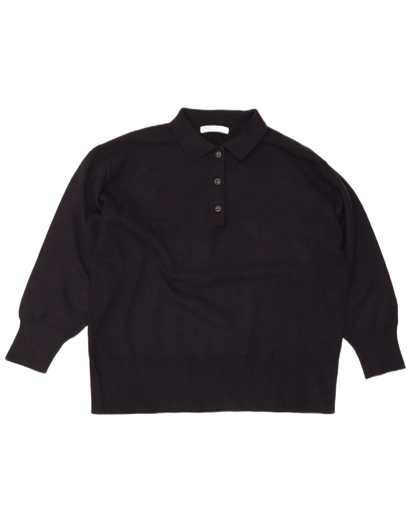 - Descrição da IA: This Zara womens Polo Neck Jumper Sweater is crafted from a soft black knit fabric. It features a classic collared neckline with a button-up placket for a refined touch. As mangas compridas terminam com punhos canelados confortáveis. O ajuste relaxado garante facilidade de uso e uma silhueta confortável. This pullover design offers timeless style and versatility.