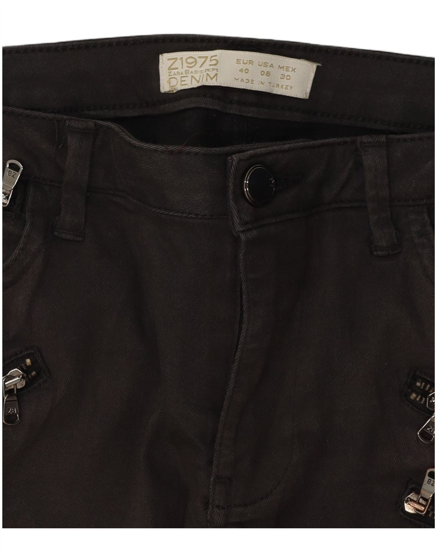 - Descrição da IA: Estes jeans skinny femininos da Zara são confeccionados em jeans preto, oferecendo um visual elegante e moderno. Eles apresentam cintura média e fecho de correr para uma frente lisa. O ajuste fino e as pernas estreitas afunilam em direção ao tornozelo. Vários bolsos com zíper na frente e zíperes nos tornozelos adicionam um estilo motociclista distinto. Este projeto combina estrutura com detalhes contemporâneos.