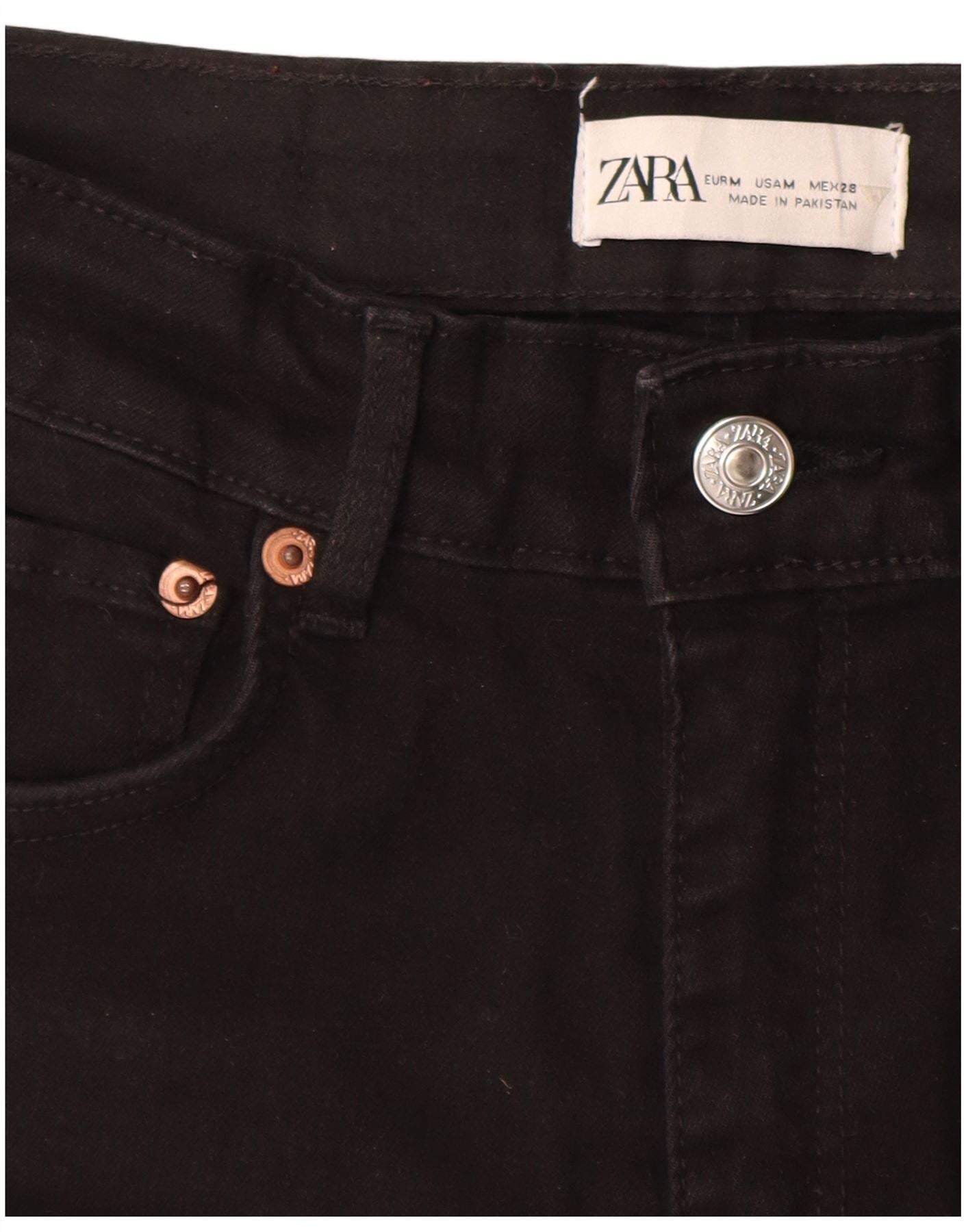 - Descrição da IA: Este jeans skinny feminino da Zara é confeccionado em jeans preto com acabamento liso. Eles apresentam cintura alta e fecho de botão, criando uma silhueta elegante. O design de ajuste fino afunila perfeitamente na perna para um visual moderno. Bolsos funcionais acrescentam praticidade. Os botões tonais fornecem um destaque sutil. Este estilo versátil oferece uma base contemporânea para qualquer roupa.