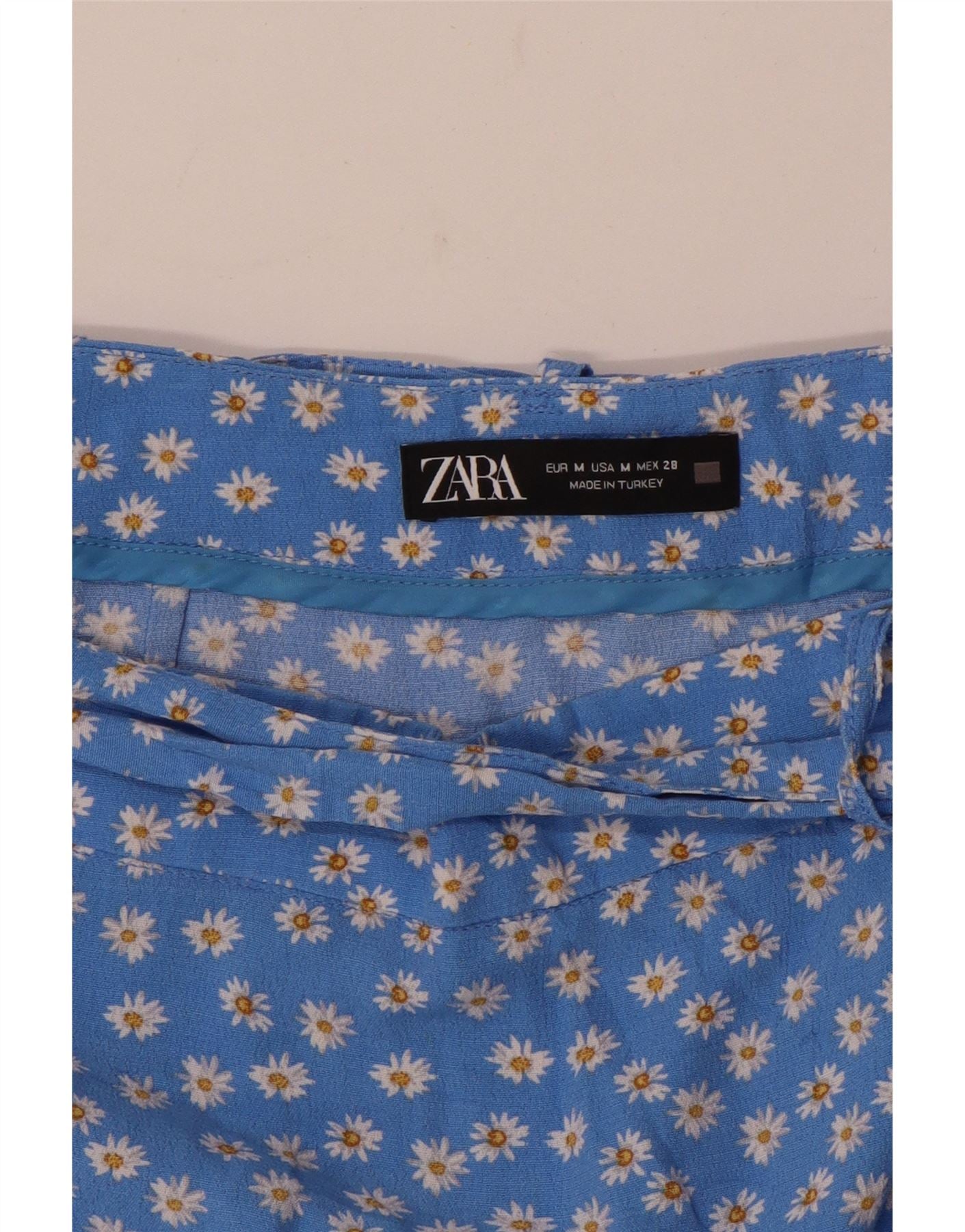 - Descrição da IA: Esta saia larga feminina da Zara é confeccionada em tecido leve de rayon. Possui um fundo azul vibrante adornado com um delicado padrão floral. O ajuste descontraído e a silhueta larga oferecem movimentos confortáveis. Um design envolvente com cintura com cinto cria um formato lisonjeiro. Aperta com um discreto fecho de correr. O cinto pode ser amarrado em um laço para dar um toque feminino adicional.