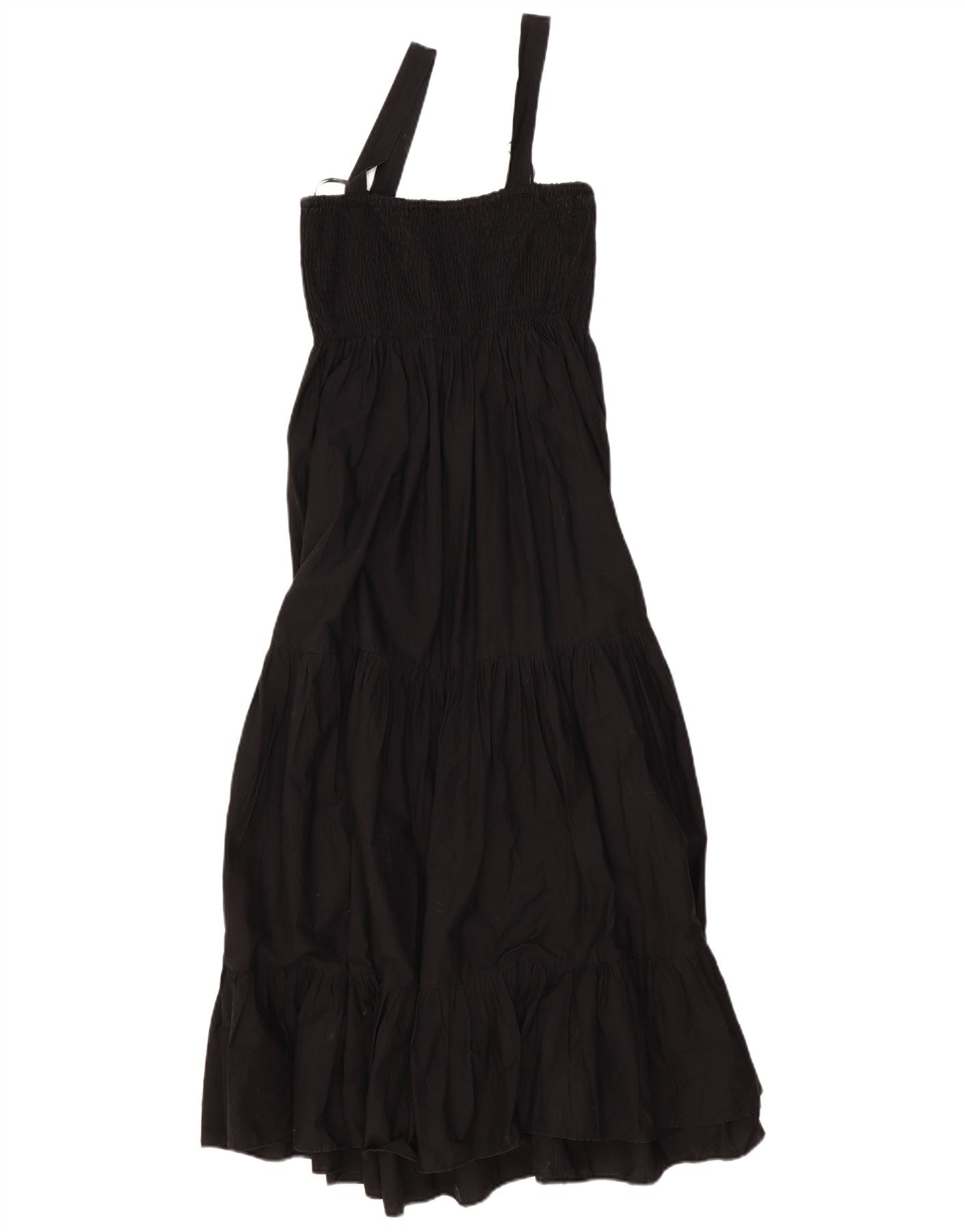 - Descrição da IA: Este vestido feminino em camadas da Zara é feito de tecido 100% algodão, oferecendo uma sensação confortável e respirável. Possui decote quadrado e design sem mangas com alças largas. A cintura império é elástica e franzida, criando uma silhueta lisonjeira. A saia flui em camadas descontraídas. Seu estilo pull-on garante facilidade de uso. A cor preta oferece opções de estilo versáteis. Este vestido combina conforto com uma estética boêmia.
