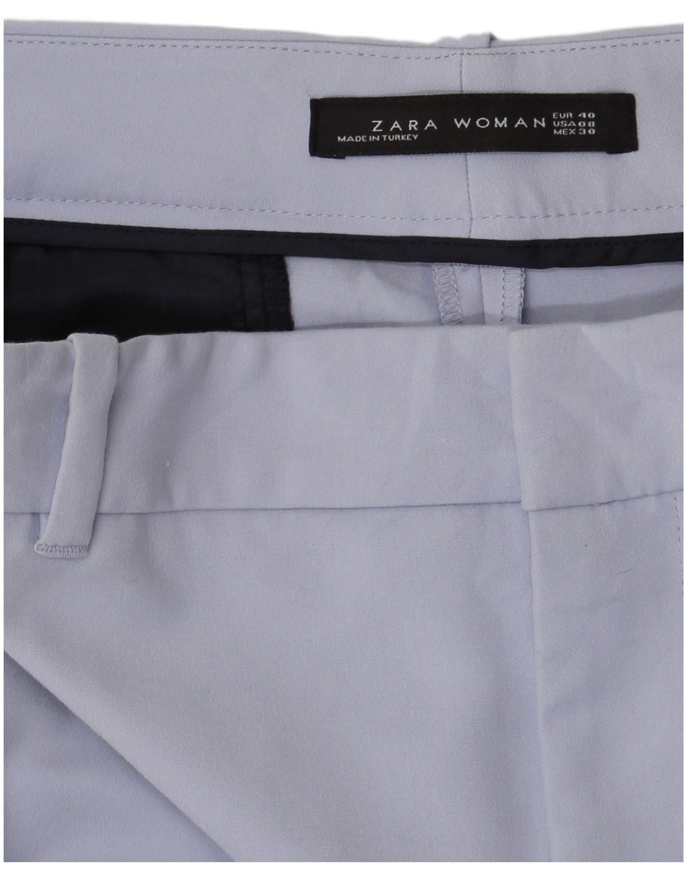 - Descrição da IA: Estas calças curtas femininas da Zara são confeccionadas em tecido liso azul claro. Eles apresentam cintura alta e fecho de correr, criando uma frente limpa. O ajuste regular garante conforto. Pernas afuniladas estreitam-se graciosamente em direção ao tornozelo. Bolsos sutis acrescentam praticidade. Este estilo clássico oferece uso versátil.