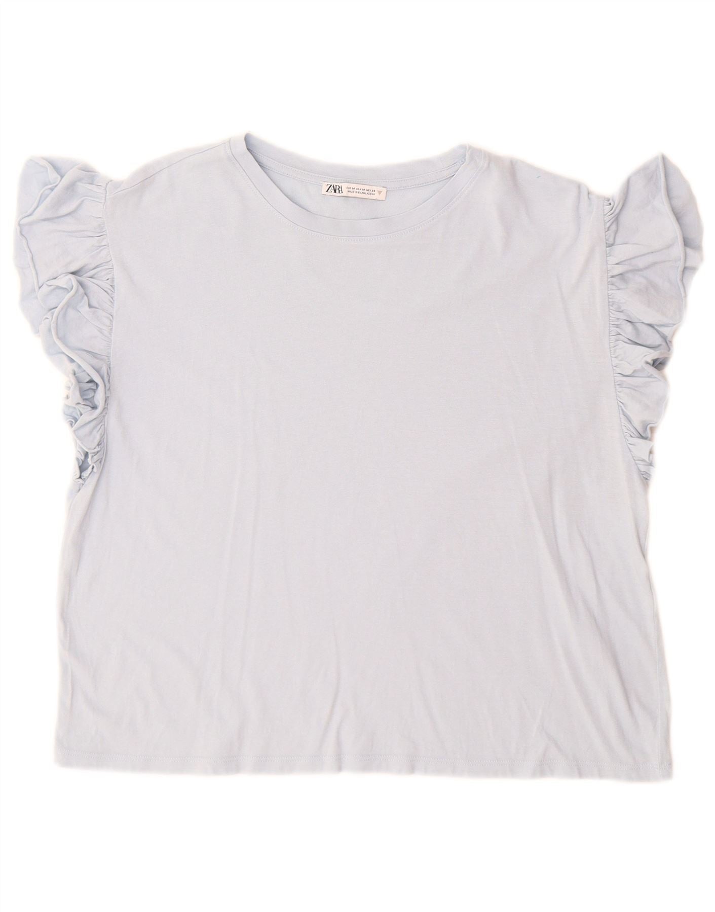 - Descrição da IA: Esta camiseta feminina da Zara é confeccionada em tecido jersey azul macio. Possui um decote redondo clássico e um ajuste regular confortável. As mangas curtas são realçadas com delicados detalhes em babados, adicionando um toque moderno e feminino. Este pulôver oferece estilo e conforto sem esforço para uso diário.